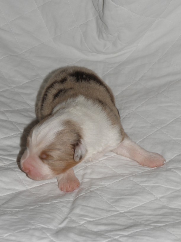 Pikaopohlaví: pesbarva: red merle s bílými znaky, pálení ocas: NBT
